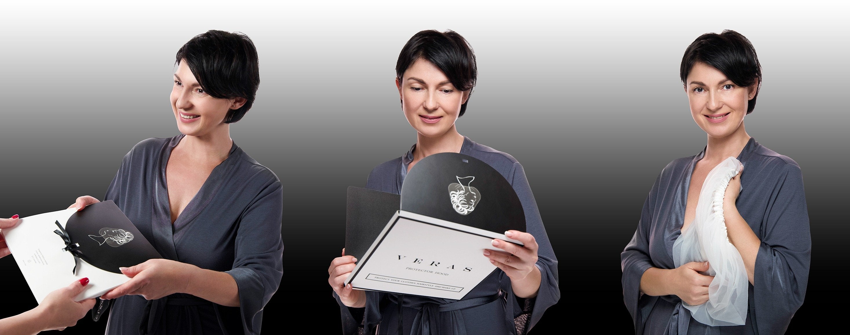 The VERAS PROTECTOR HOOD (VPH) is a head cover, worn while dressing, that protects hairstyles and prevents makeup from staining clothes.